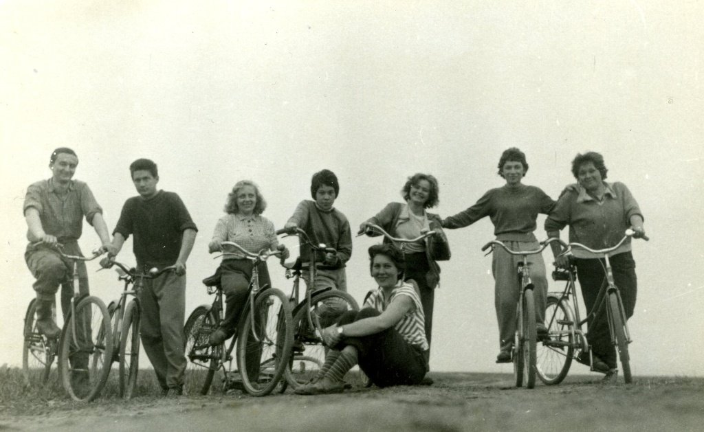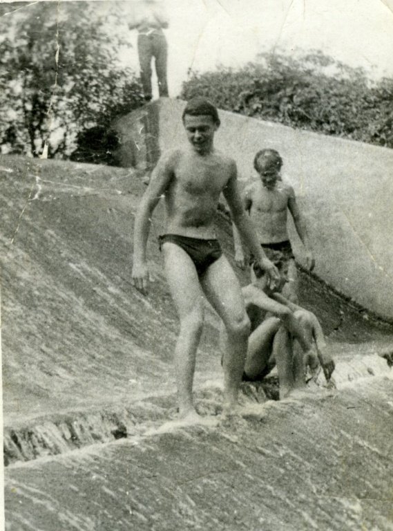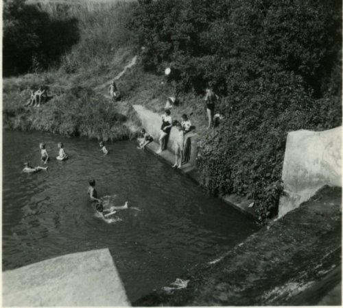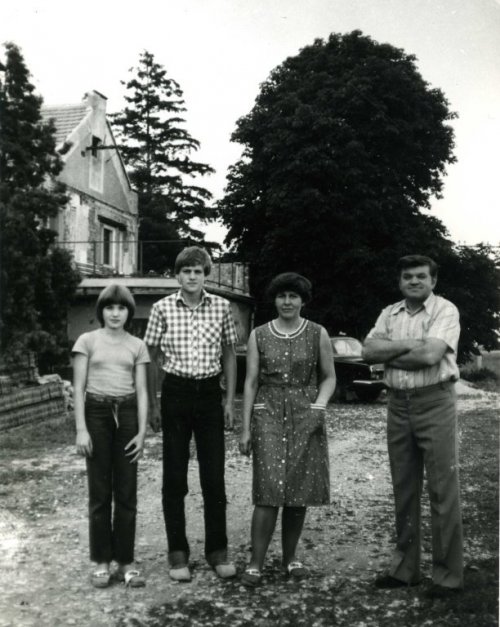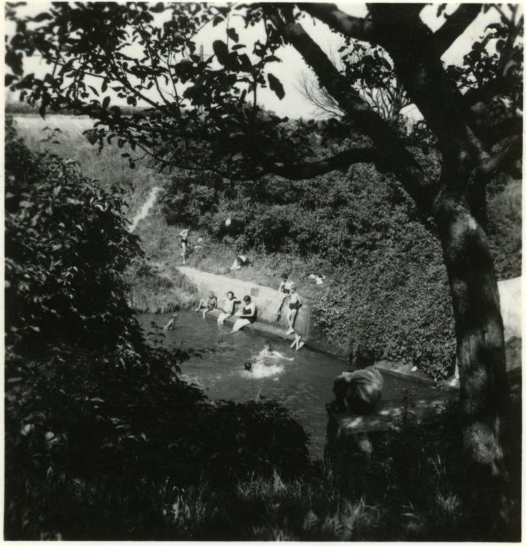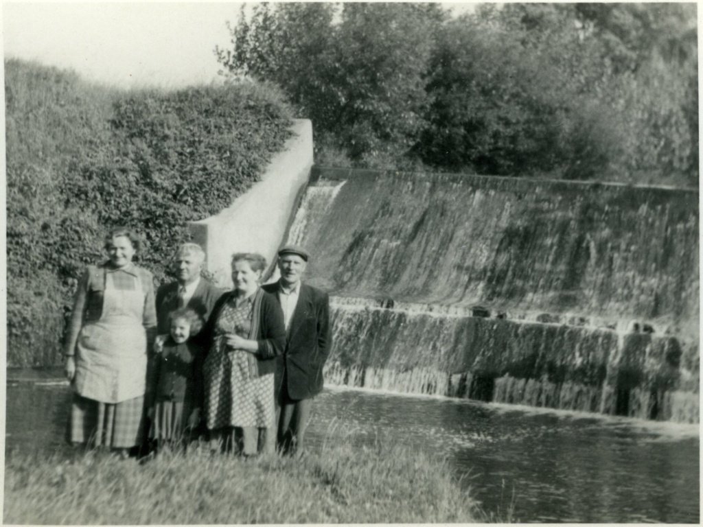 U splavu na Svodnici. Zprava mlynář Ladislav Dostál, vedle něj jeho manželka Věra, rozená Zajícová. Zleva stojí Františka Zajícová (sestra Věry Dostálové), vedle ní její bratr František Zajíc s vnučkou Mařenkou. Splav poničila povodeň roku 1965