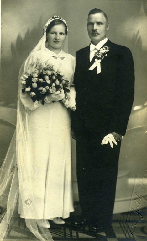Mlynář Ladislav Dostál s manželkou Věrou dne 9. září 1936. Svatební obřad proběhl ve farním kostele v Domaželicích