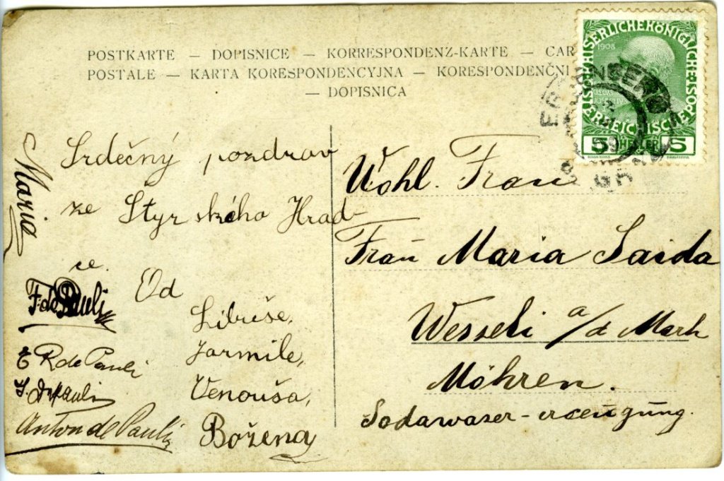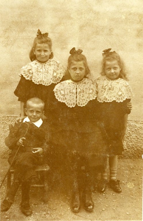 Fotka z pohlednice kterou ze Štýrského Hradce zaslala (a napsala) Libuše. Zleva Božena, Libuše, Jarmila a dole Václav (*1903)