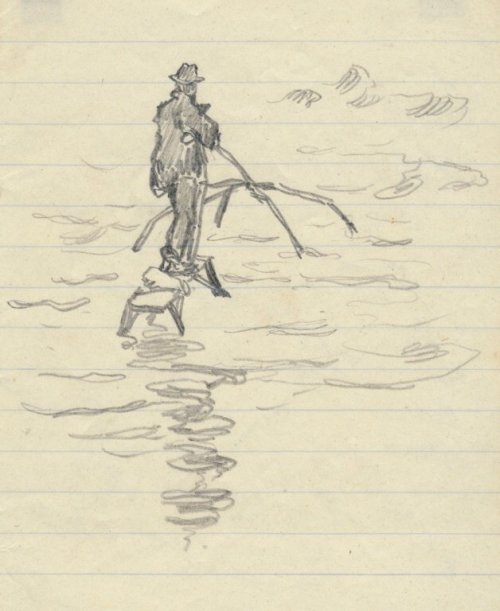 Rybář na kozlíku, kresba Ludvíka Ehrenhafta (archiv O. Gajdoruse)