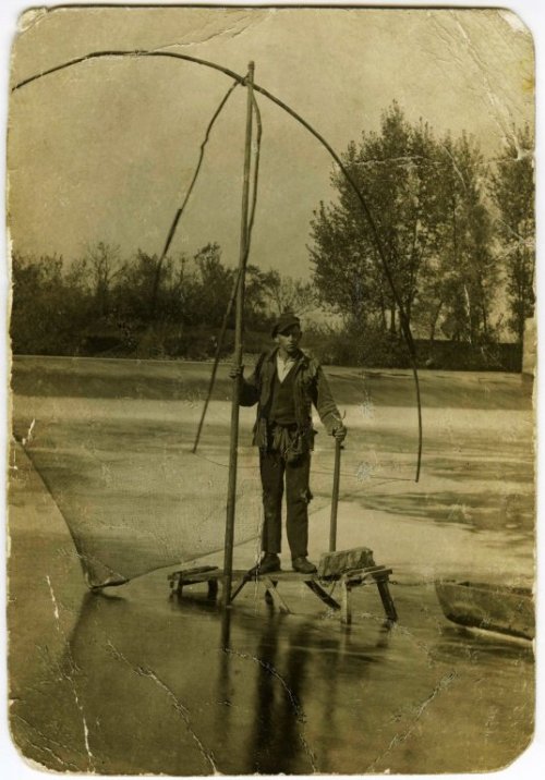 Rybář s čeřenem u stavu