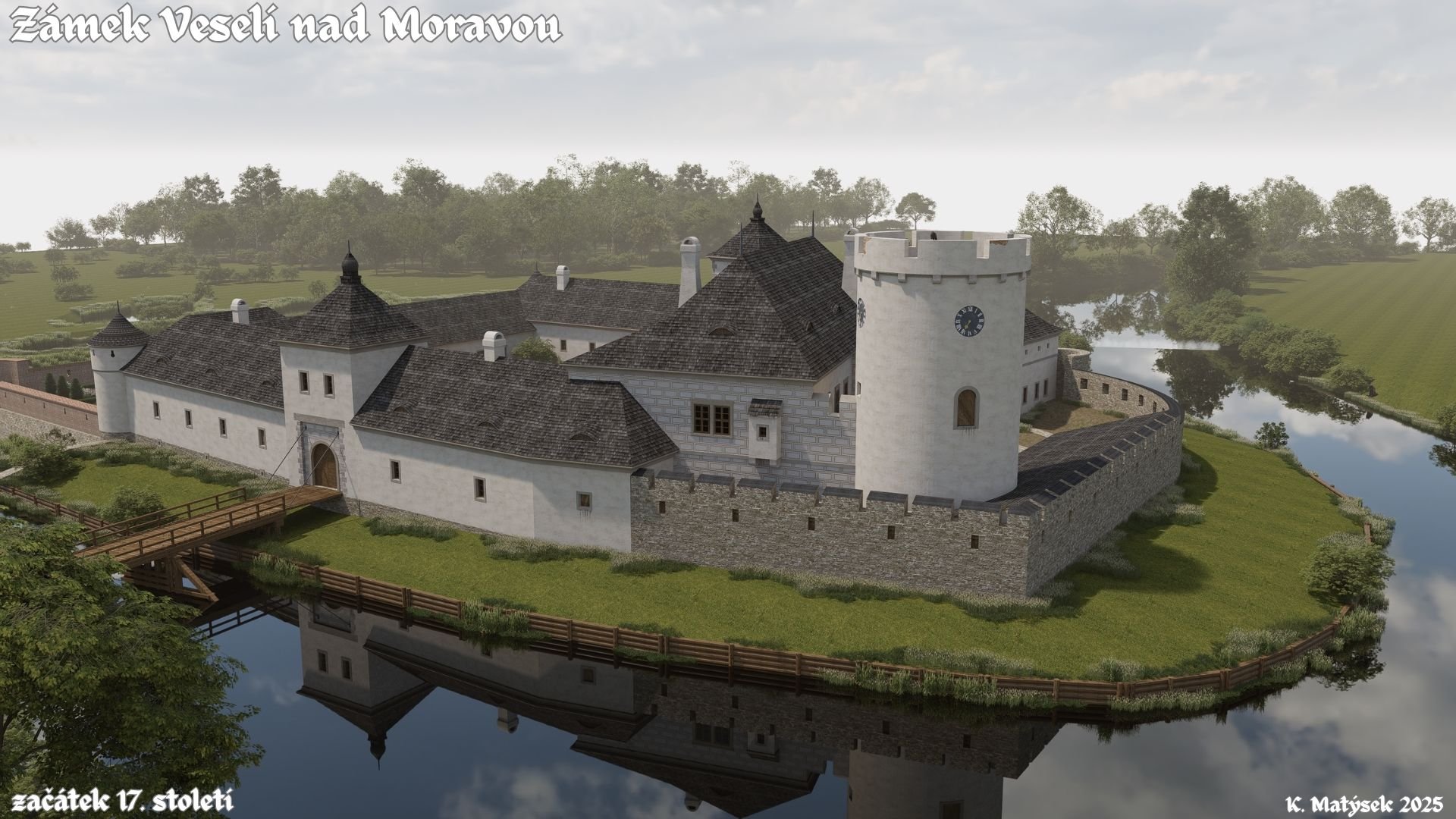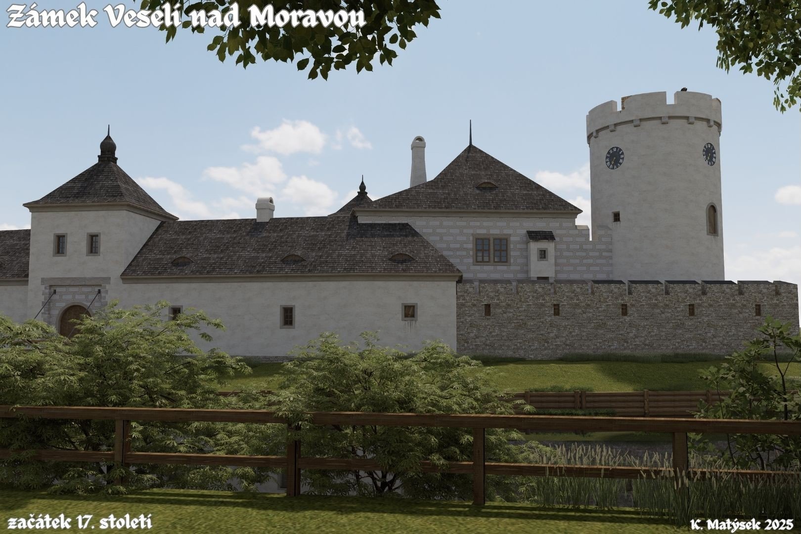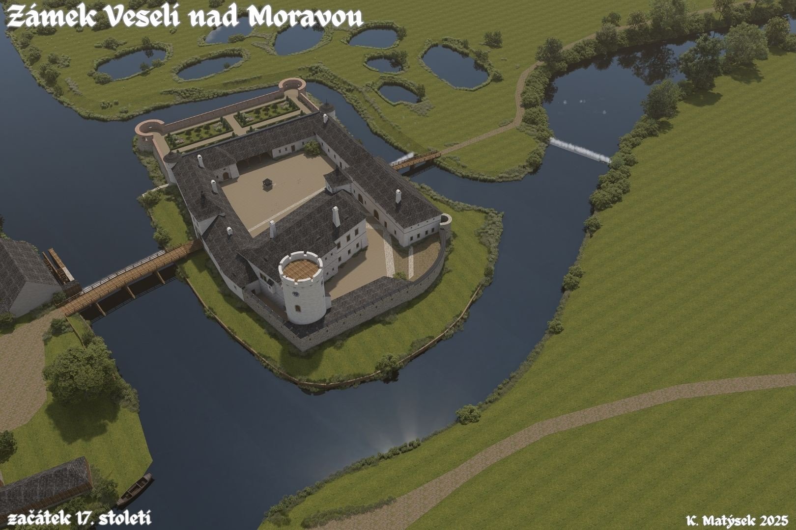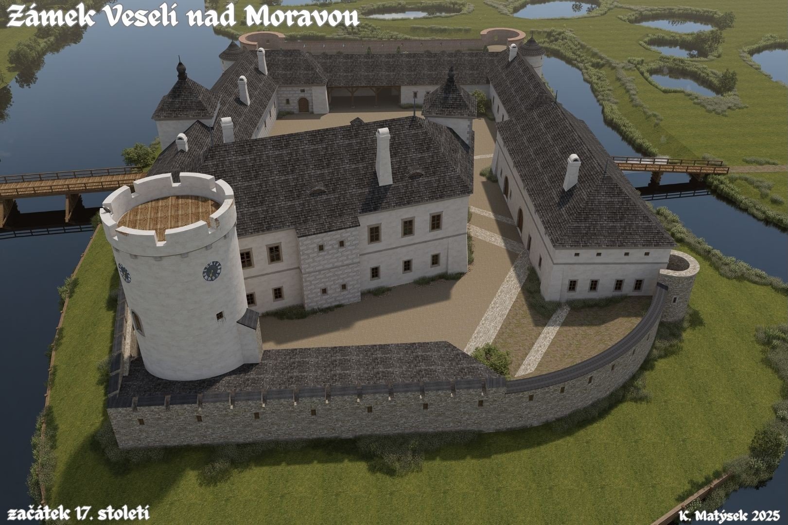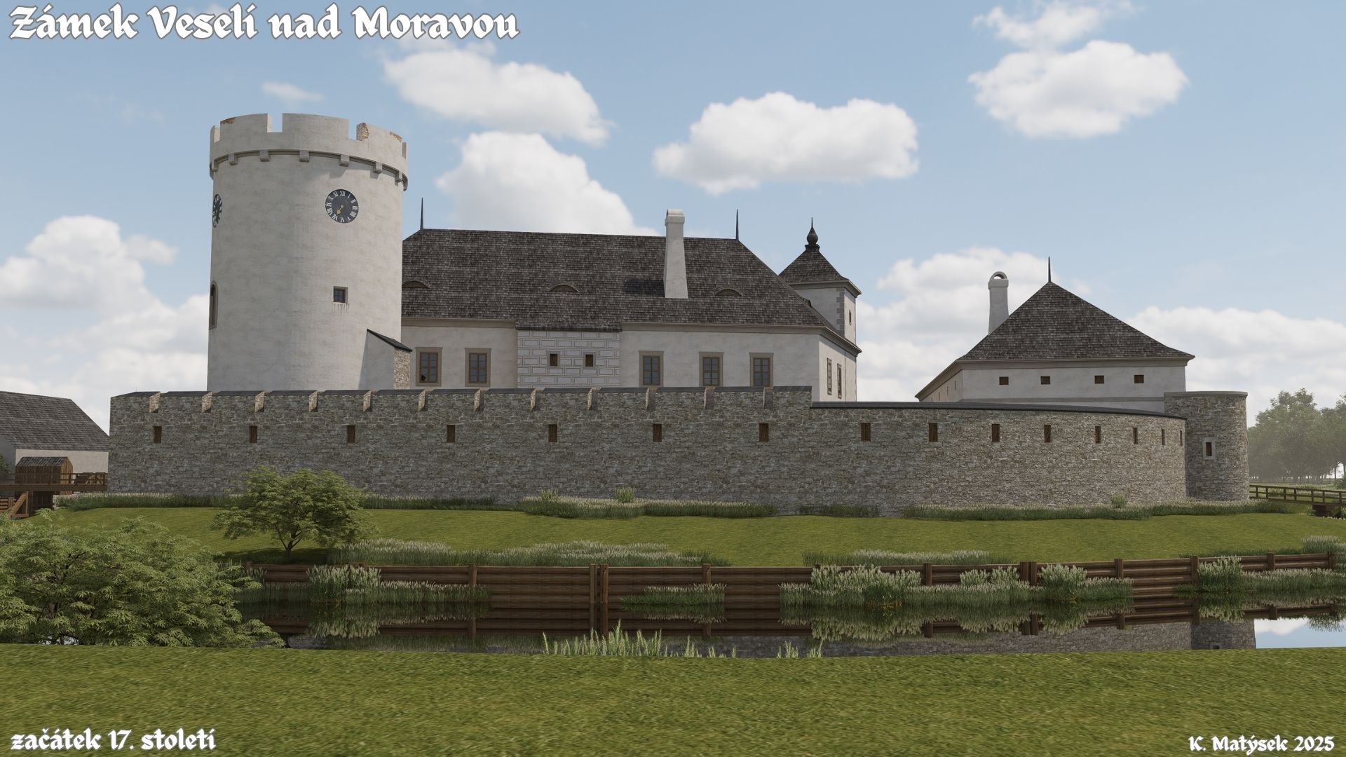 Hypotetická podoba z počátku 17. století, tedy před událostmi třicetileté války a jiných pohrom, které zámek postihly v první polovině 17. století. Model je vytvořen na základě současného poznání o vývoji zámku, jeho historie a vývoje podobných sídel v bezprostředním okolí Veselí nad Moravou. Vše vytvořeno ve 3D na základě mapových podkladů, výškopisu a polohopisu okolí, dobových map, vyobrazení, bez použití AI. Komentáře k podobě zámku jsou uvedeny u jednotlivých obrázků. Cílem bylo vytvořit alespoň rámcově představu o možné podobě a vývoji tohoto sídla, snad se mi to alespoň částečně povedlo. Kamil Matýsek