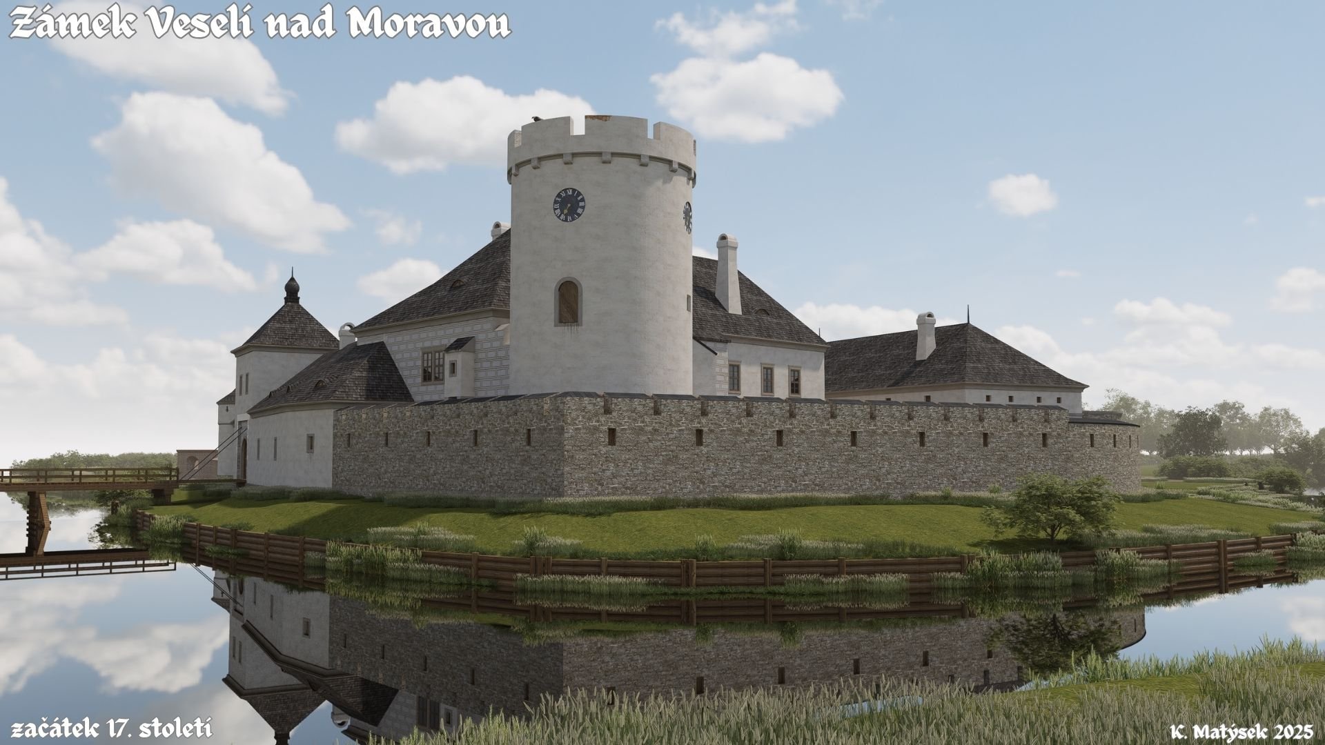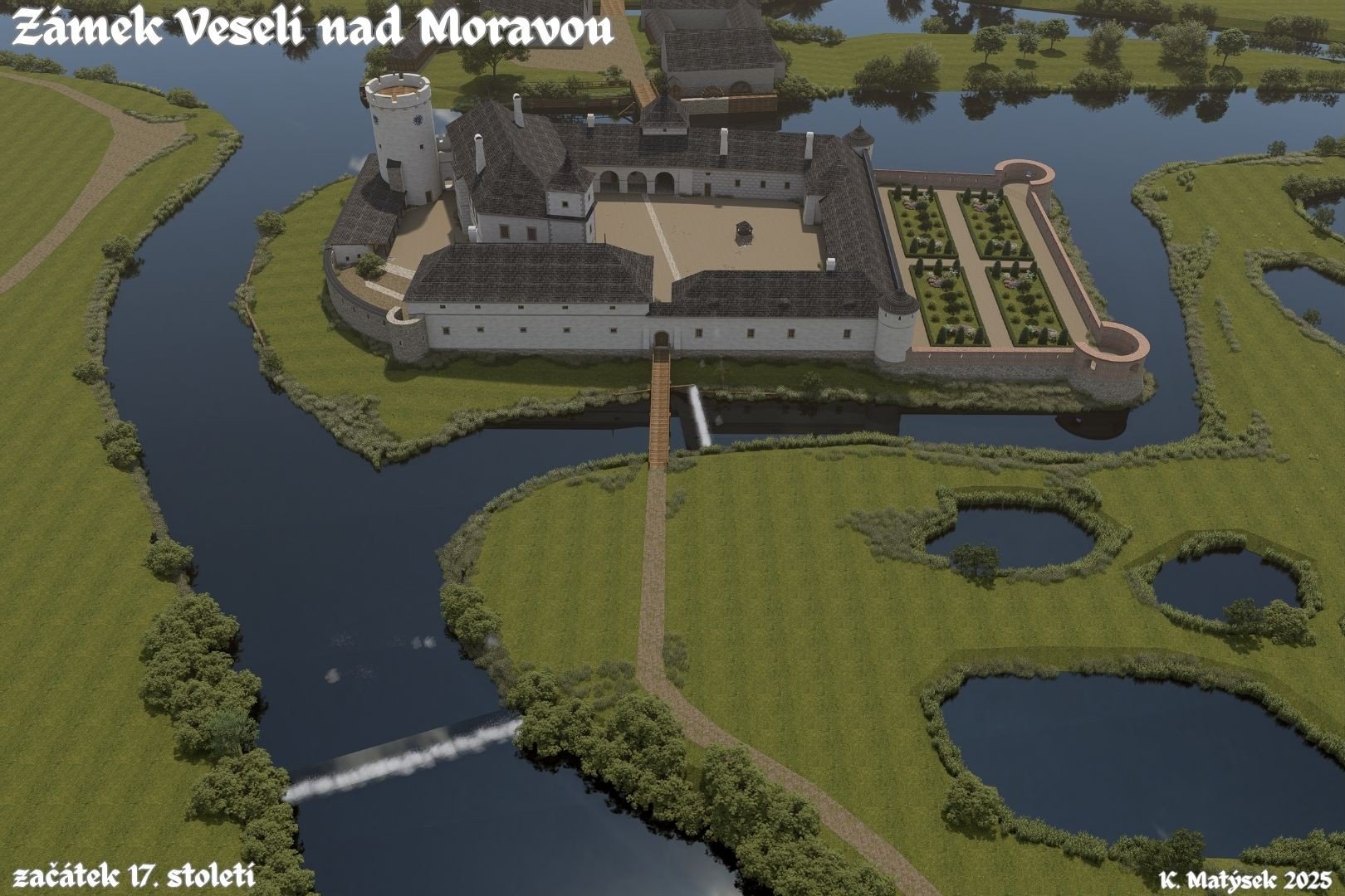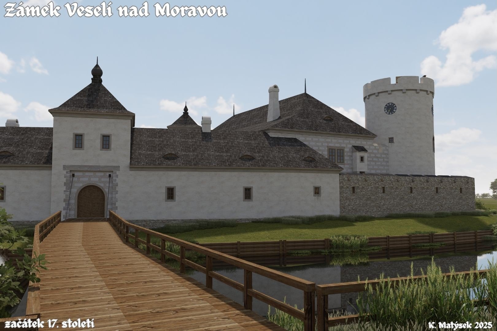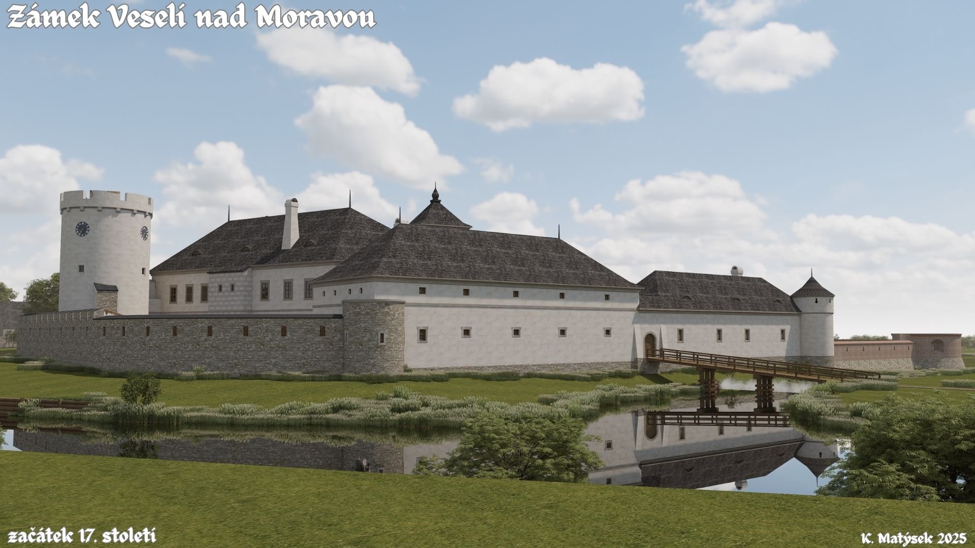 Hypotetická podoba z počátku 17. století, tedy před událostmi třicetileté války a jiných pohrom, které zámek postihly v první polovině 17. století. Model je vytvořen na základě současného poznání o vývoji zámku, jeho historie a vývoje podobných sídel v bezprostředním okolí Veselí nad Moravou. Vše vytvořeno ve 3D na základě mapových podkladů, výškopisu a polohopisu okolí, dobových map, vyobrazení, bez použití AI. Komentáře k podobě zámku jsou uvedeny u jednotlivých obrázků. Cílem bylo vytvořit alespoň rámcově představu o možné podobě a vývoji tohoto sídla, snad se mi to alespoň částečně povedlo. Kamil Matýsek
