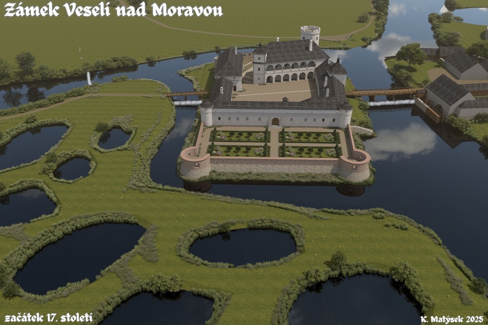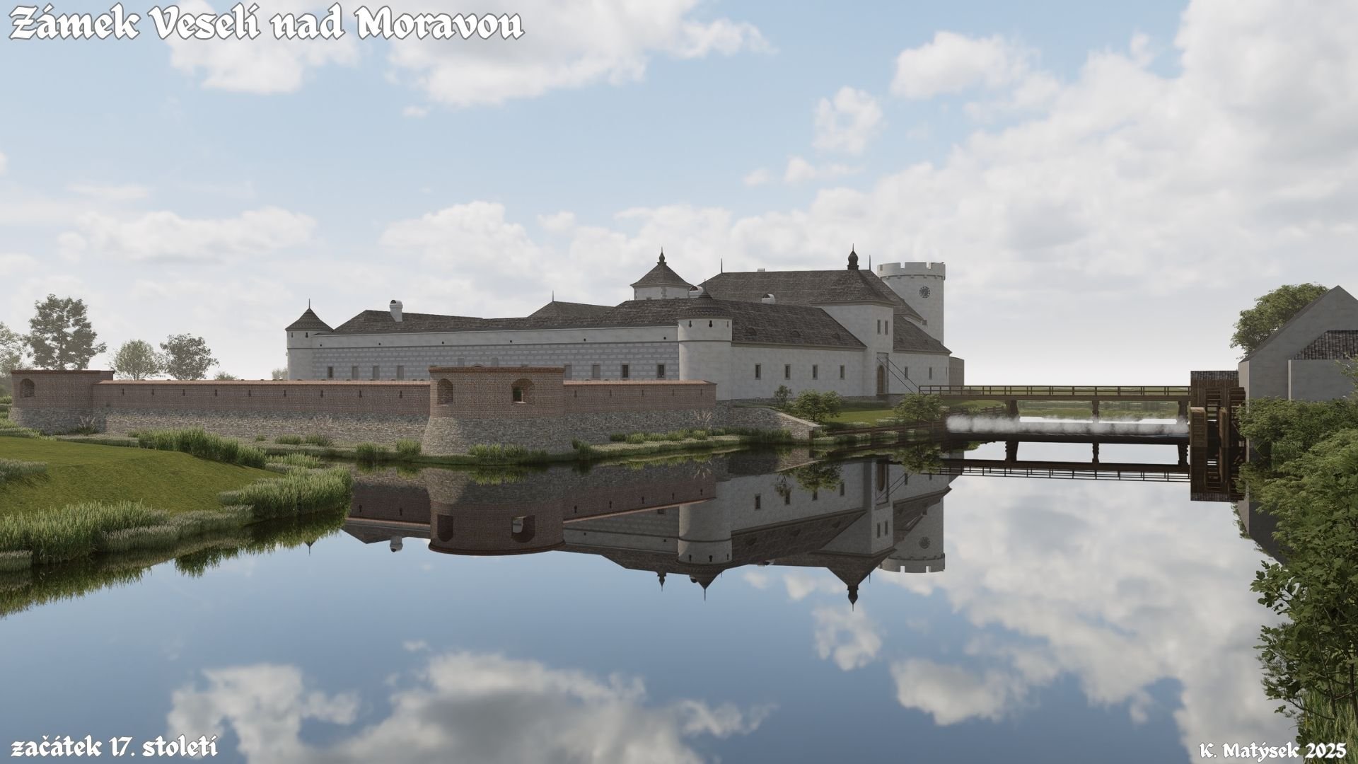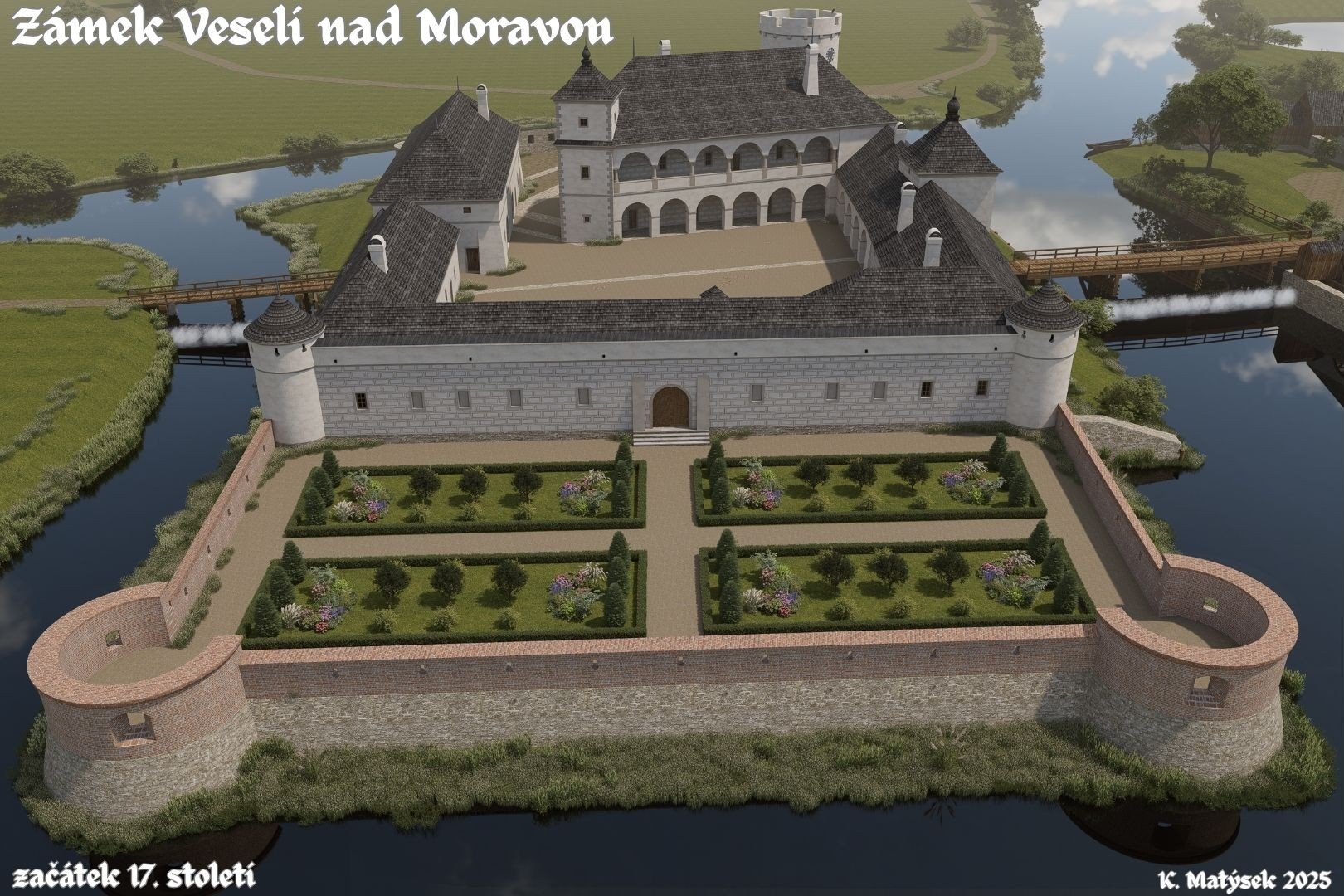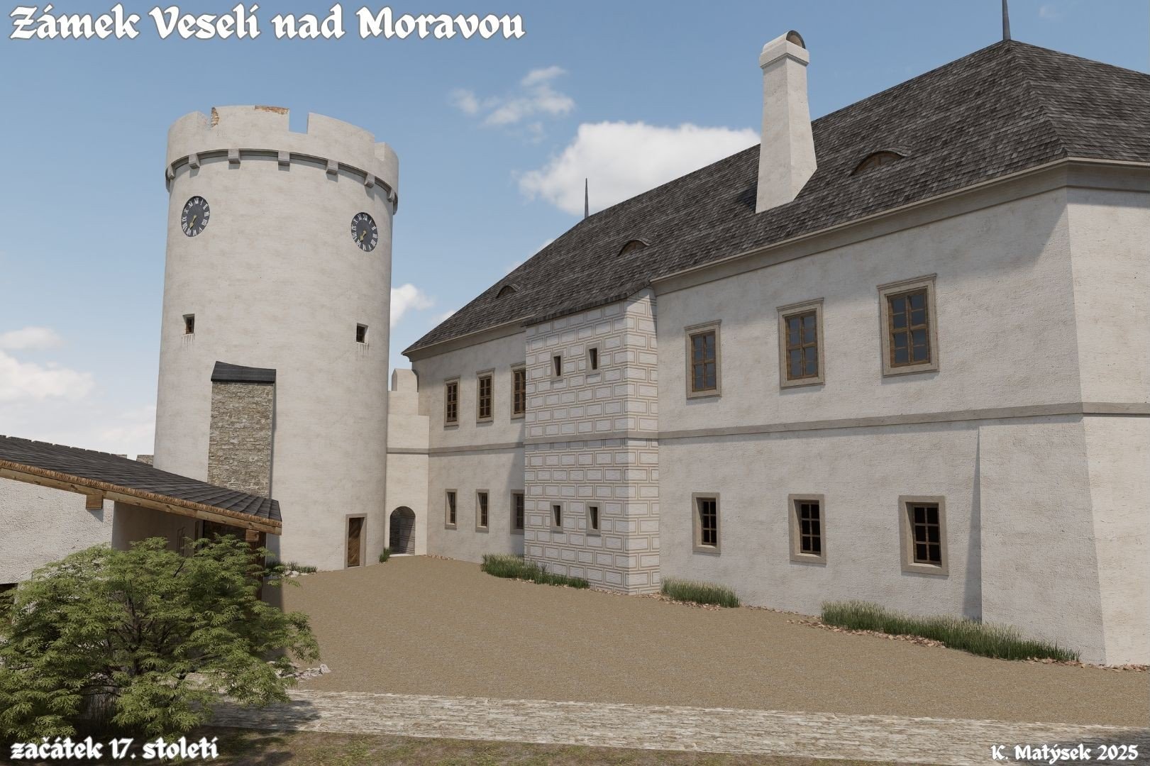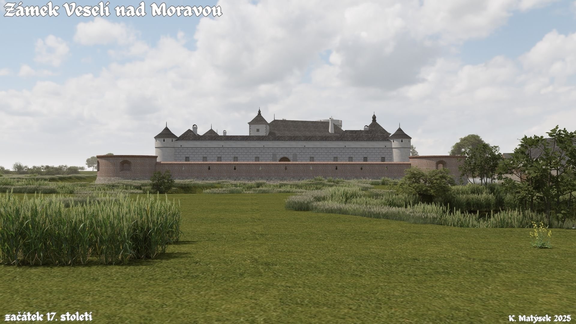 Hypotetická podoba z počátku 17. století, tedy před událostmi třicetileté války a jiných pohrom, které zámek postihly v první polovině 17. století. Model je vytvořen na základě současného poznání o vývoji zámku, jeho historie a vývoje podobných sídel v bezprostředním okolí Veselí nad Moravou. Vše vytvořeno ve 3D na základě mapových podkladů, výškopisu a polohopisu okolí, dobových map, vyobrazení, bez použití AI. Komentáře k podobě zámku jsou uvedeny u jednotlivých obrázků. Cílem bylo vytvořit alespoň rámcově představu o možné podobě a vývoji tohoto sídla, snad se mi to alespoň částečně povedlo. Kamil Matýsek