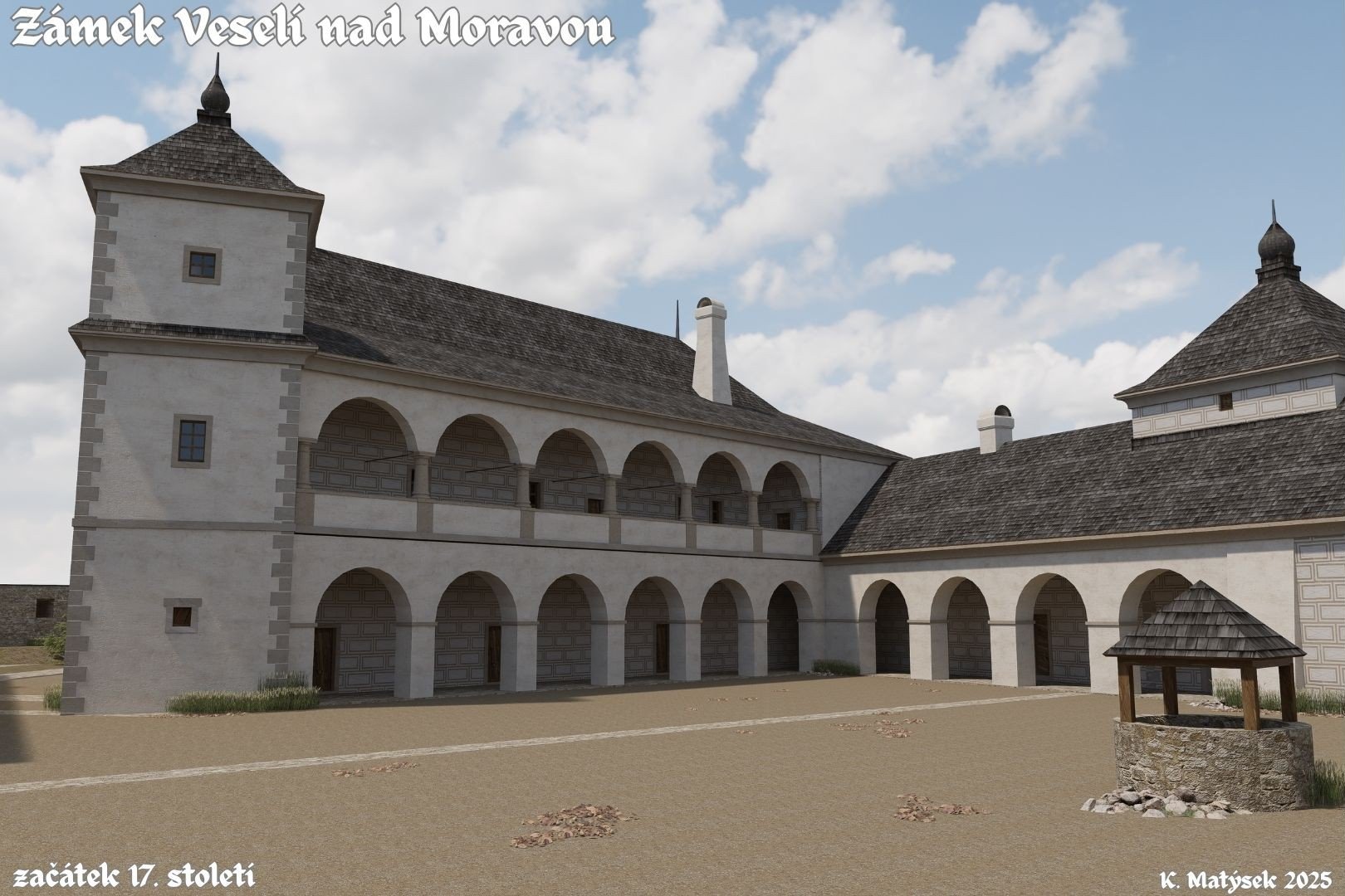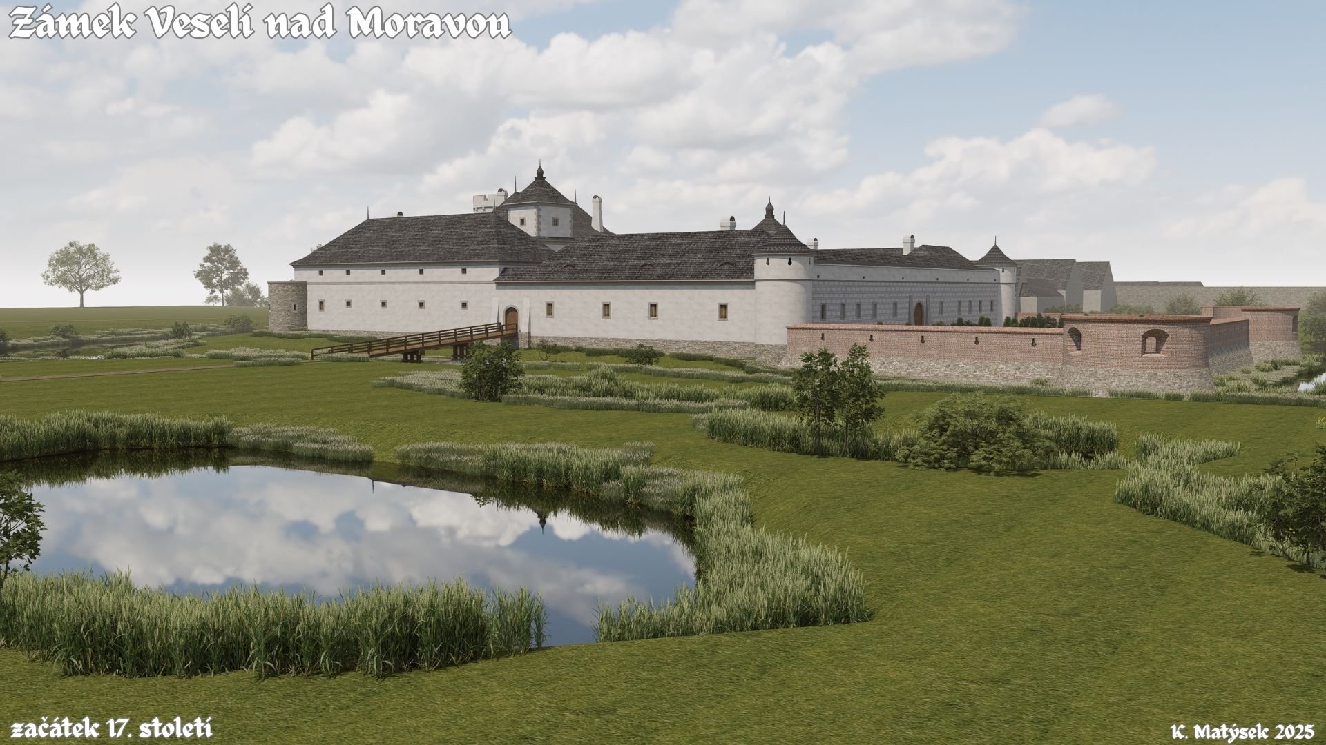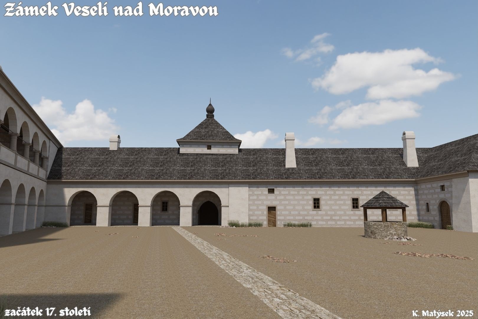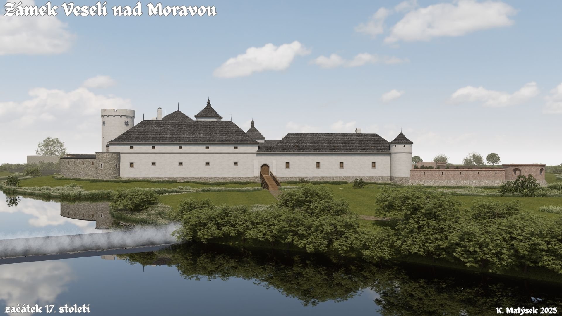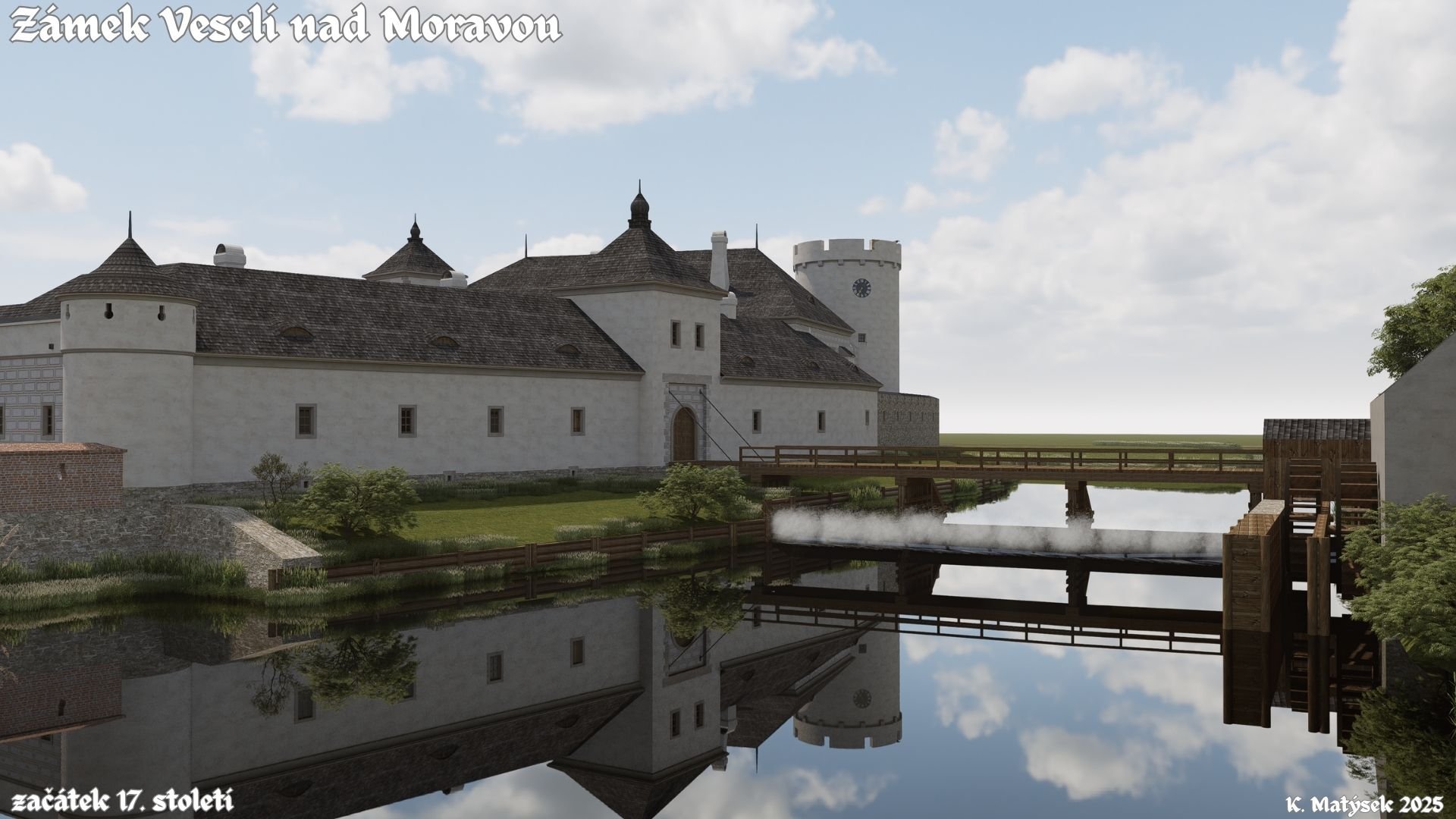 Hypotetická podoba z počátku 17. století, tedy před událostmi třicetileté války a jiných pohrom, které zámek postihly v první polovině 17. století. Model je vytvořen na základě současného poznání o vývoji zámku, jeho historie a vývoje podobných sídel v bezprostředním okolí Veselí nad Moravou. Vše vytvořeno ve 3D na základě mapových podkladů, výškopisu a polohopisu okolí, dobových map, vyobrazení, bez použití AI. Komentáře k podobě zámku jsou uvedeny u jednotlivých obrázků. Cílem bylo vytvořit alespoň rámcově představu o možné podobě a vývoji tohoto sídla, snad se mi to alespoň částečně povedlo. Kamil Matýsek